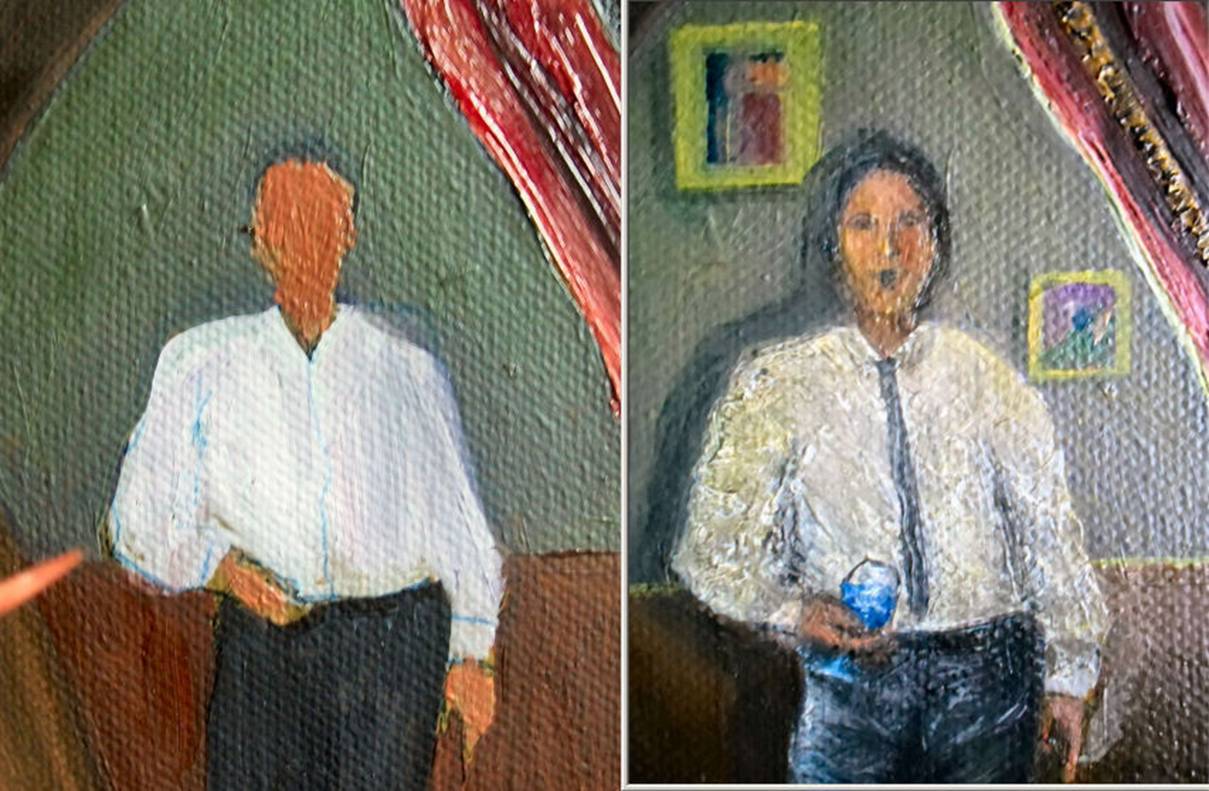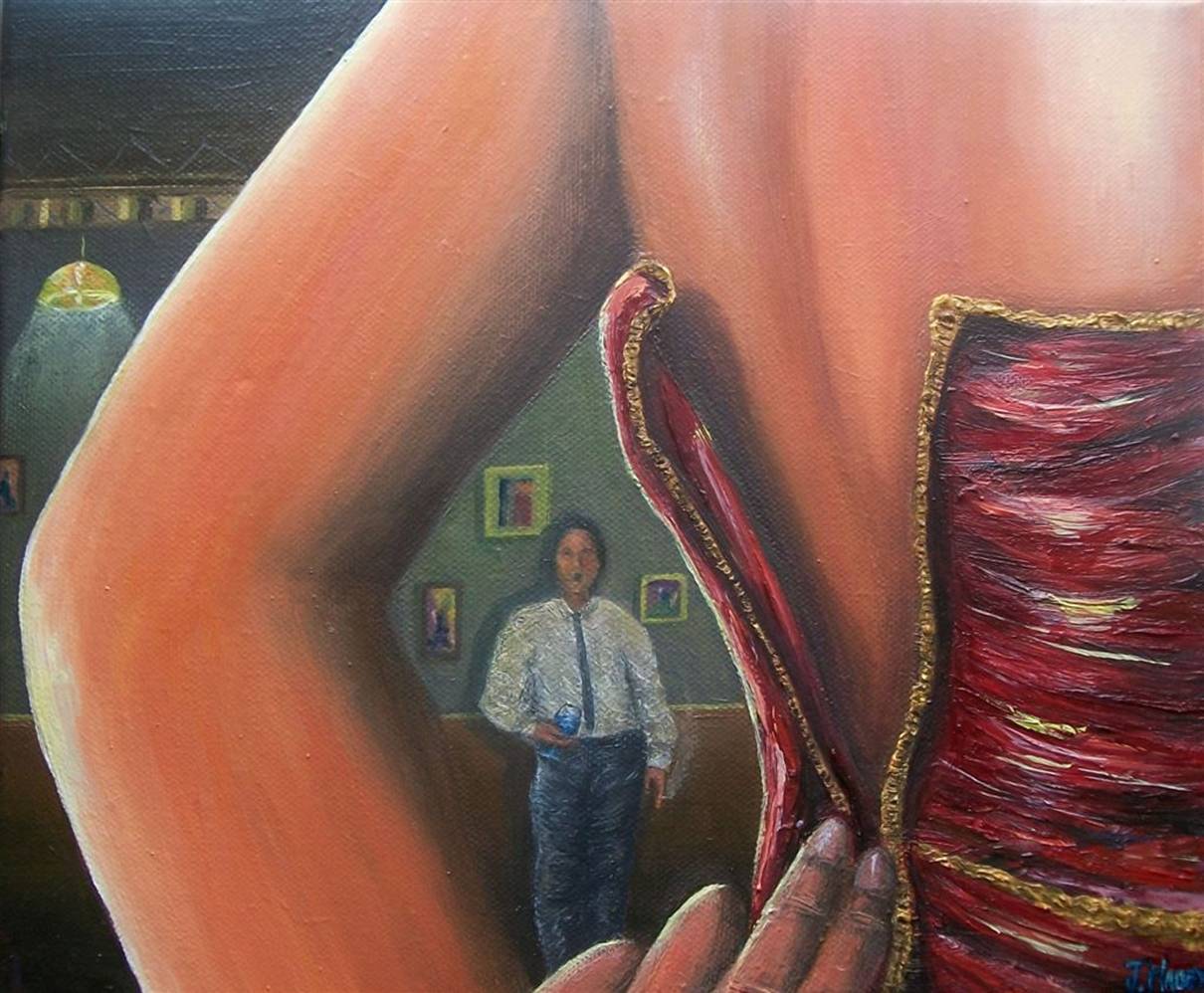 This painting shows a woman unzipping a basque for a nervous-looking onlooker. It was done quickly