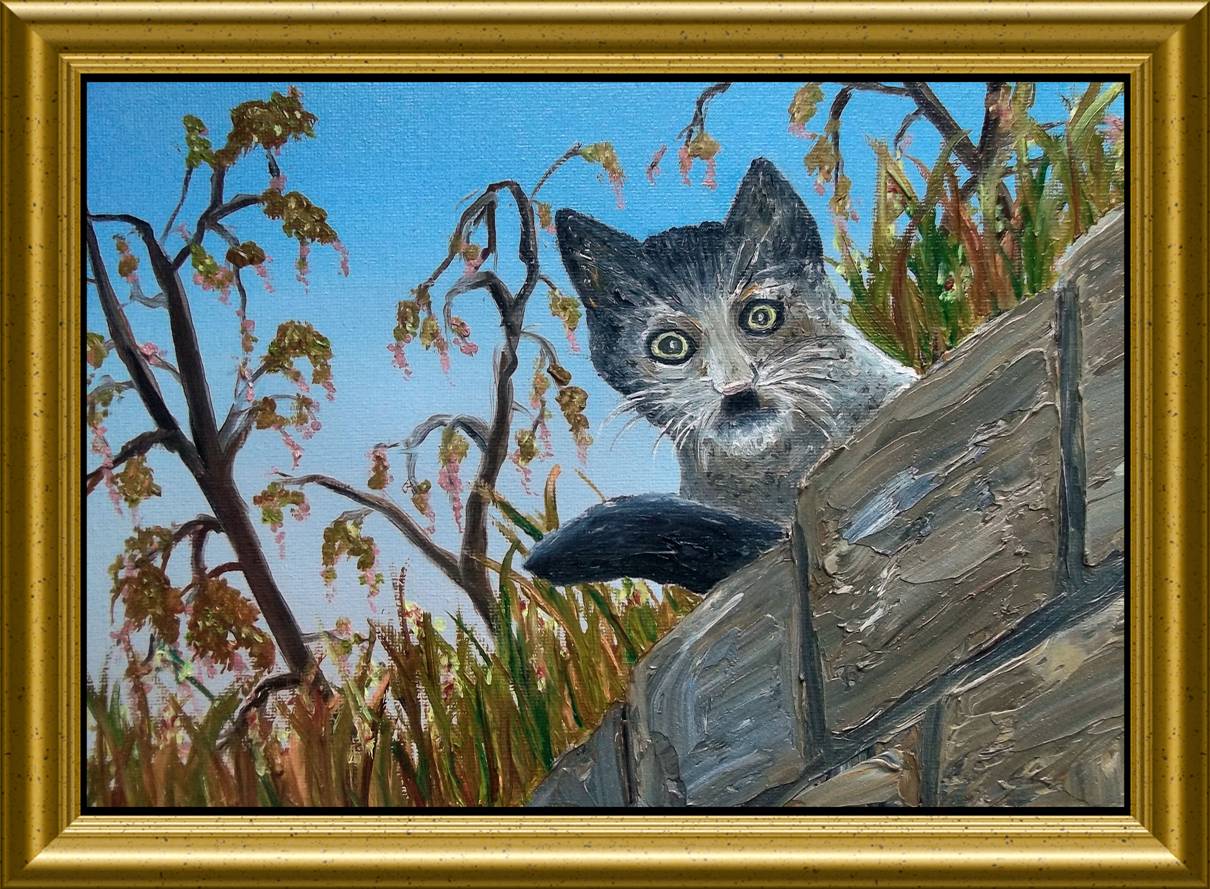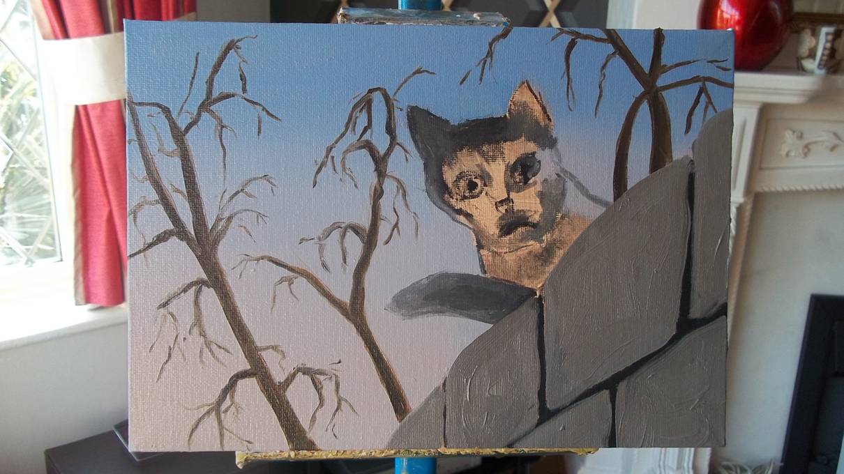 small A4 painting of a curious cat with an unfortunate tuft of black fur under
