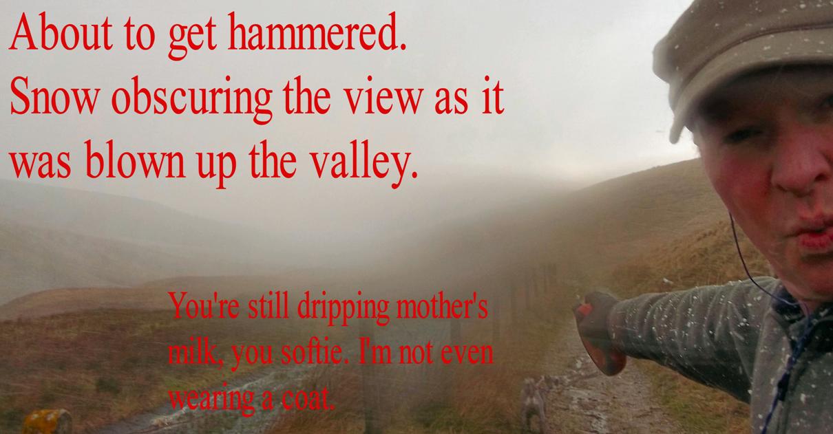 snowflakes were bashing against my face and the wind buffeted against my body.