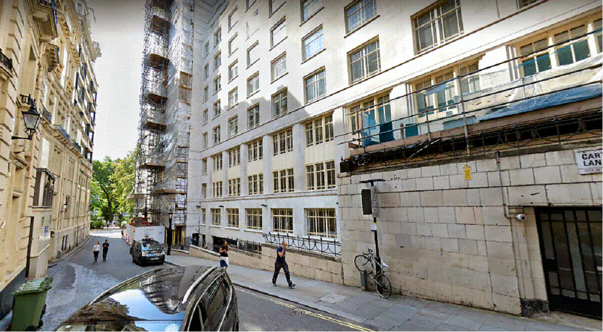 narrow lane looks onto a huge building currently occupied by Penguin books. You