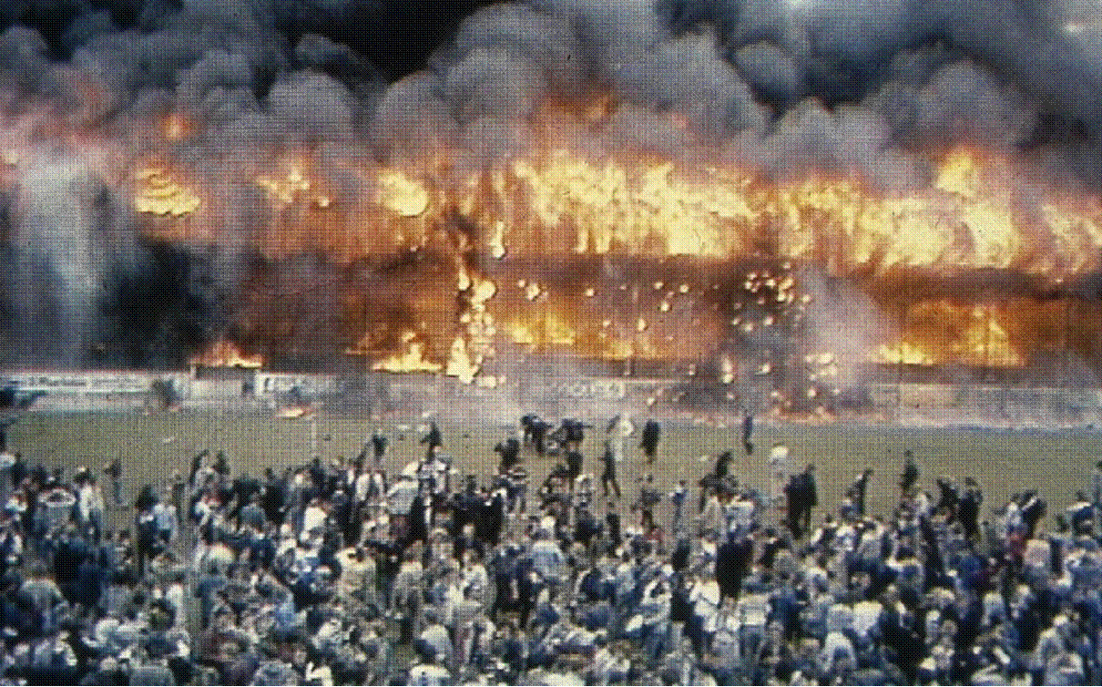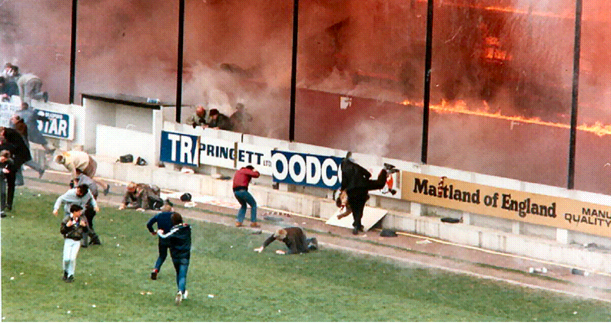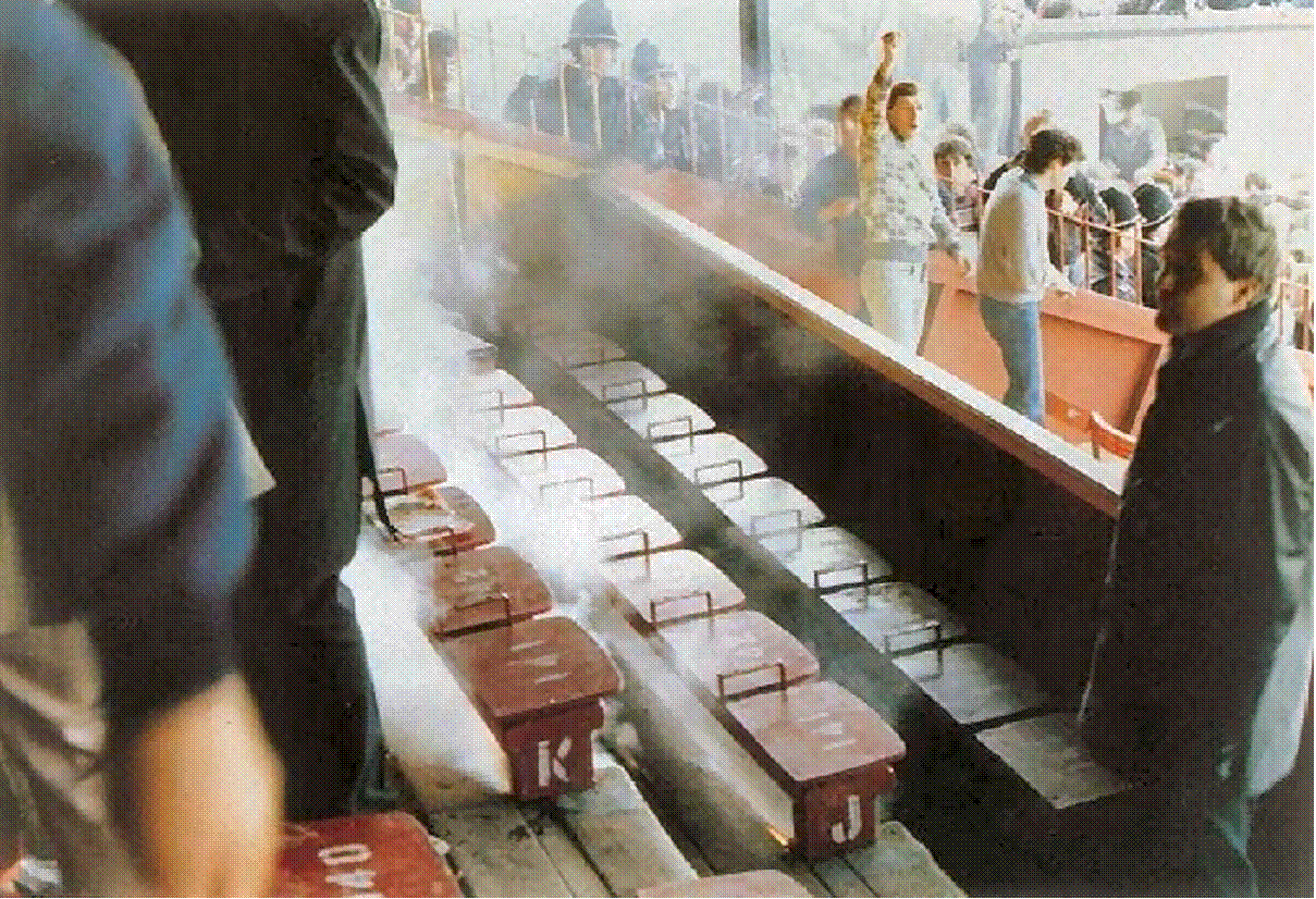 the entire stand was aflame with fire and screams. The fire brigade were called