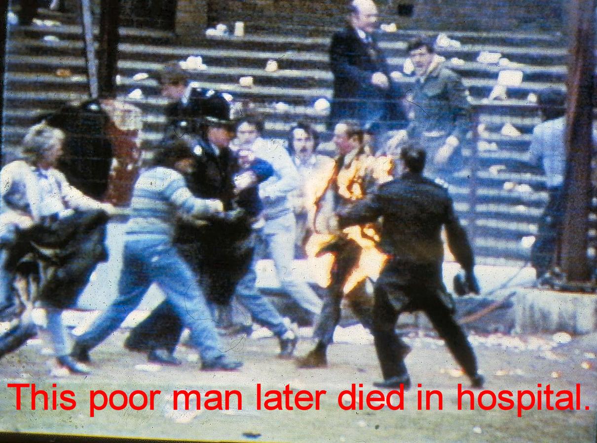 fire from head to foot but died in hospital. About 265 supporters were injured.