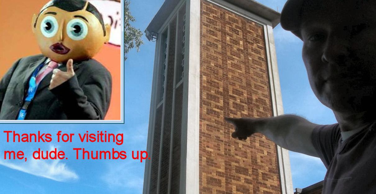 wearing a giant papier-mache head over his real head.
