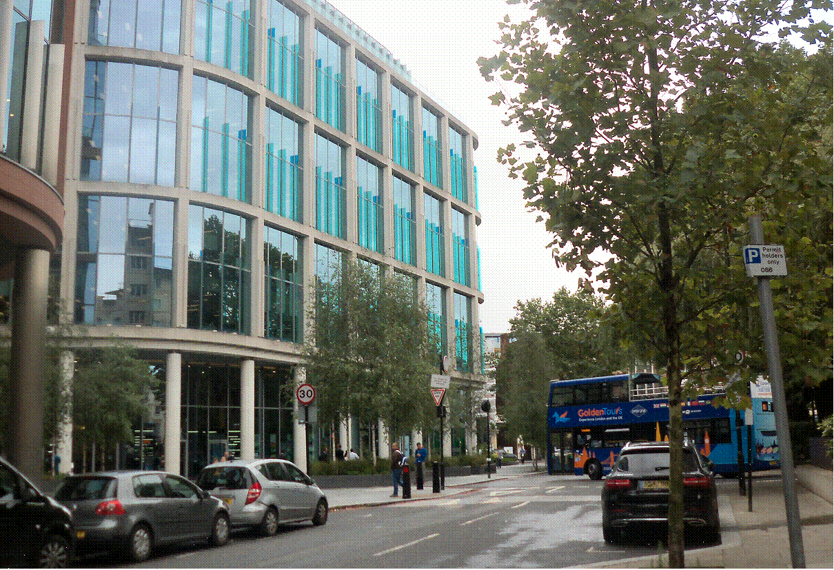 to see a blue plaque bolted onto the glass office block monstrosity that’s
