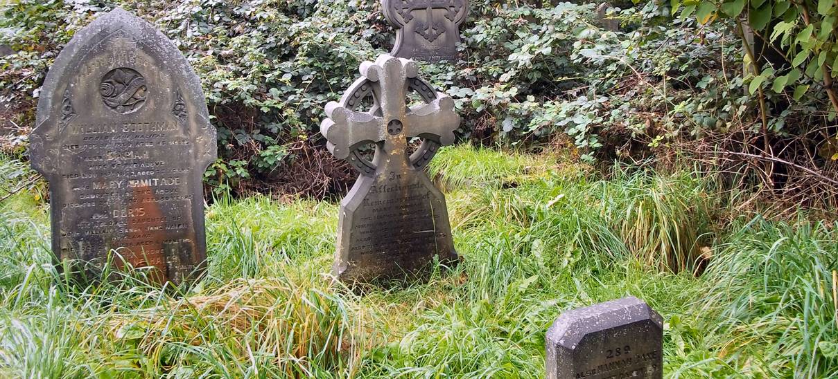overgrown and neglected. Clusters of headstones were defeated by brambles but
