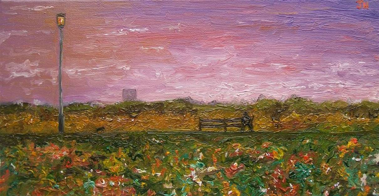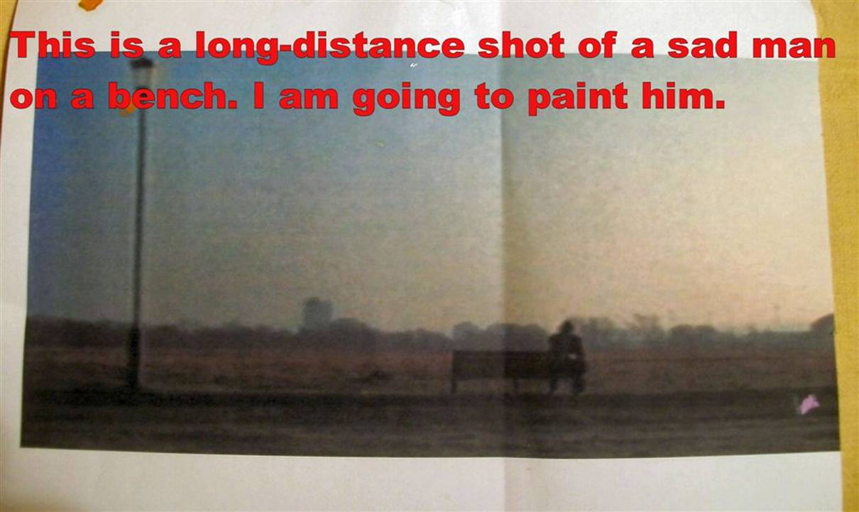 sat on a bench. He’s so far away the camera only picks up his blurred outline.