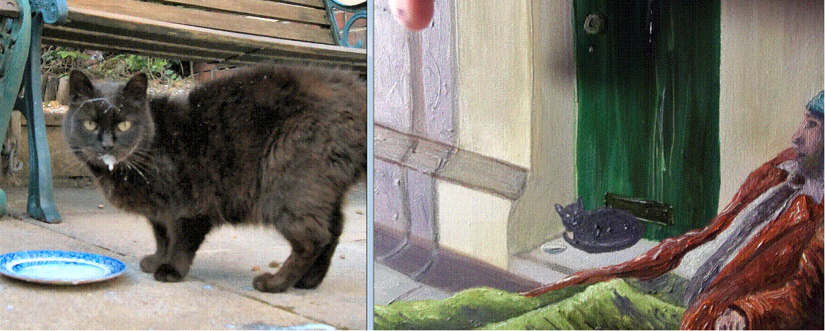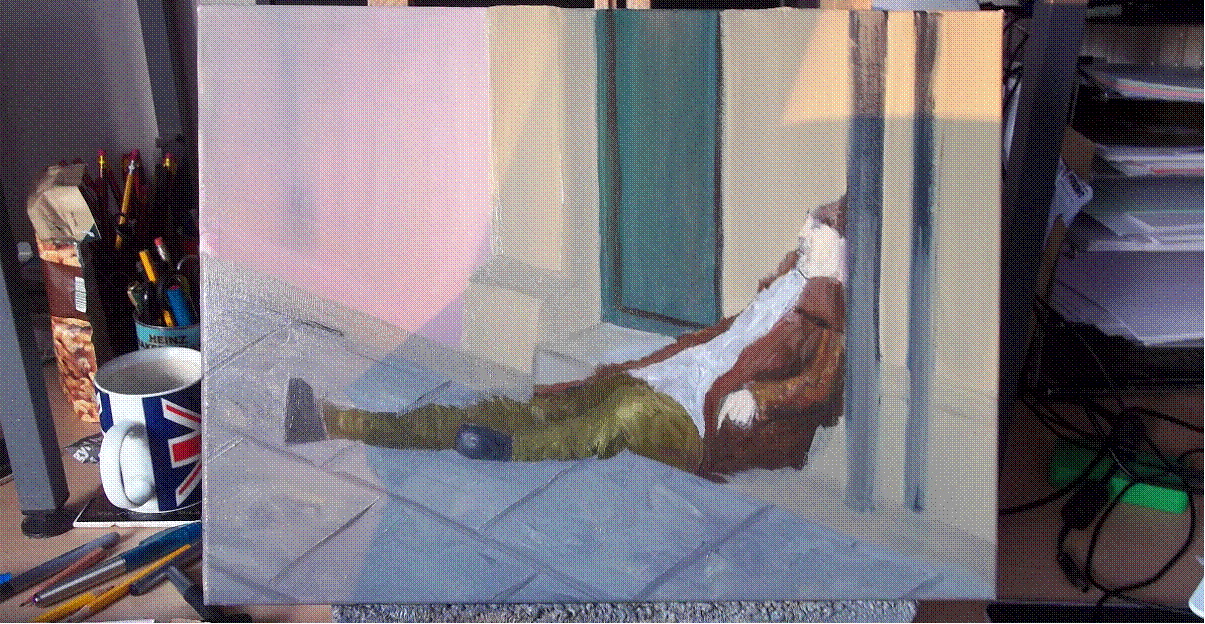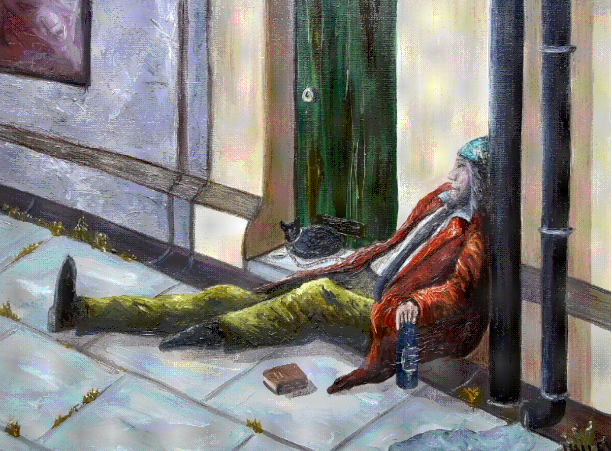painting of a tramp sitting in a gutter. I ensured I painted three things I