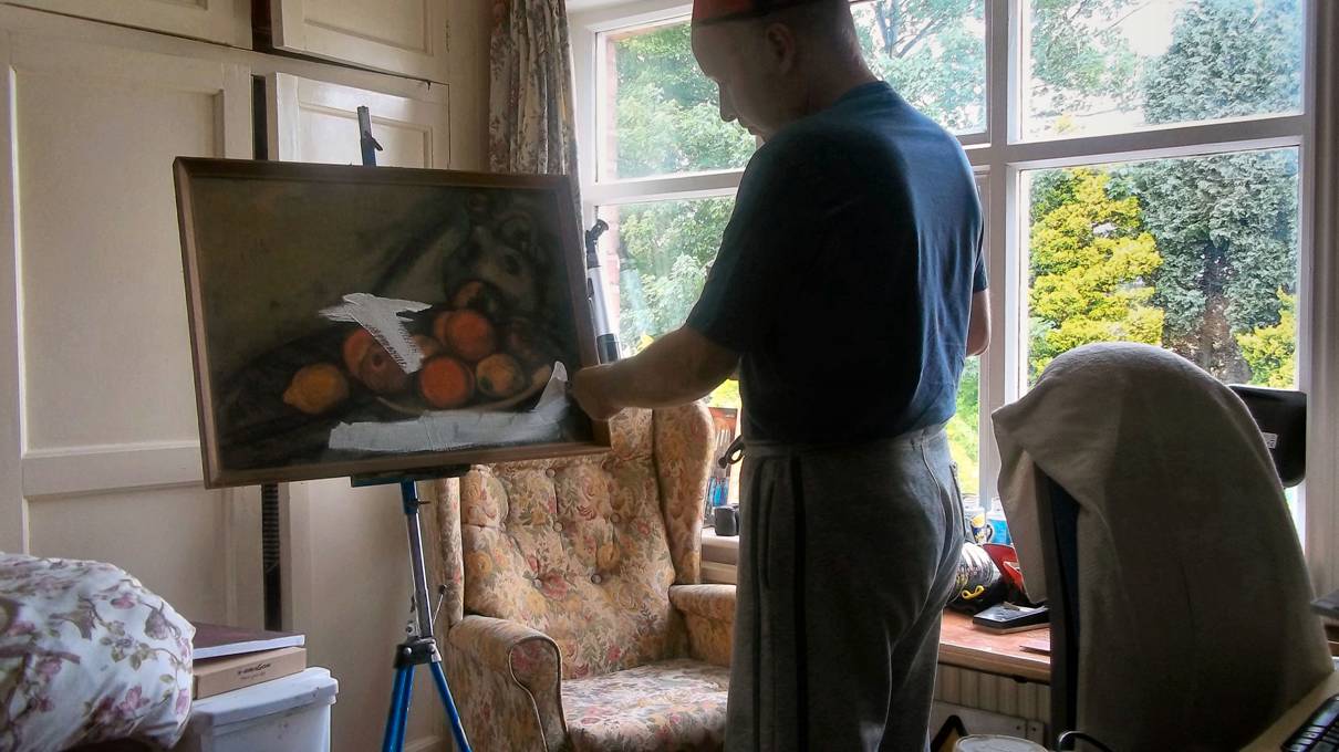 a painting by in the basement by Paul Cezane called Fruit And Jug, covered the canvas with white gesso and started drawing out a cat