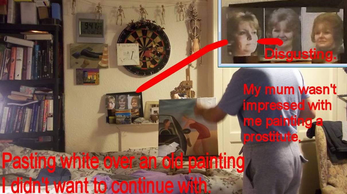 (showing a prostitute picking up a customer.) I covered it in paint and got